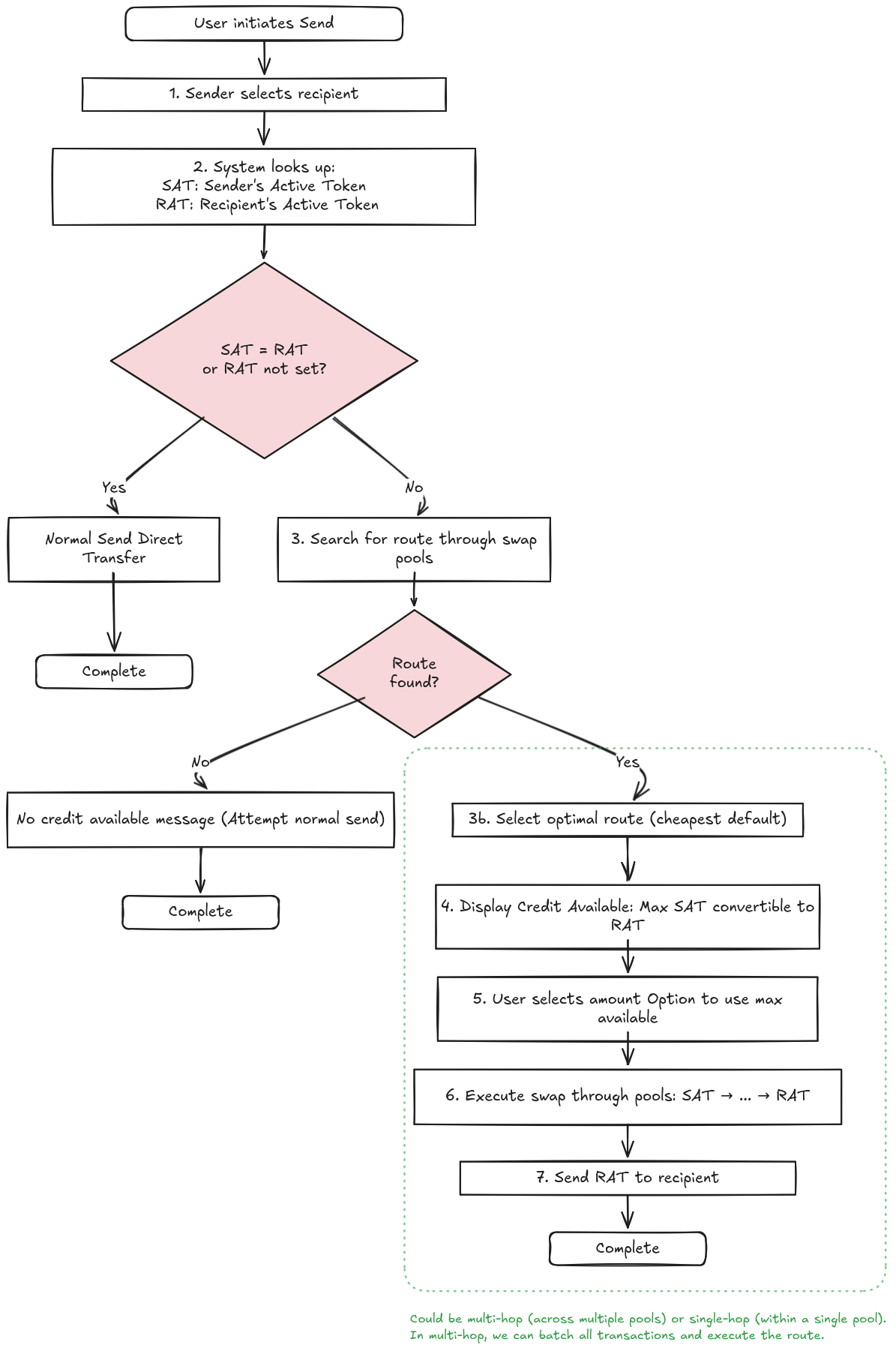 Credit Send allows you to send payment to someone using their preferred token, even when you hold a different token. The protocol automatically swaps your tokens through swap pools, making cross-community payments as easy as a regular send.